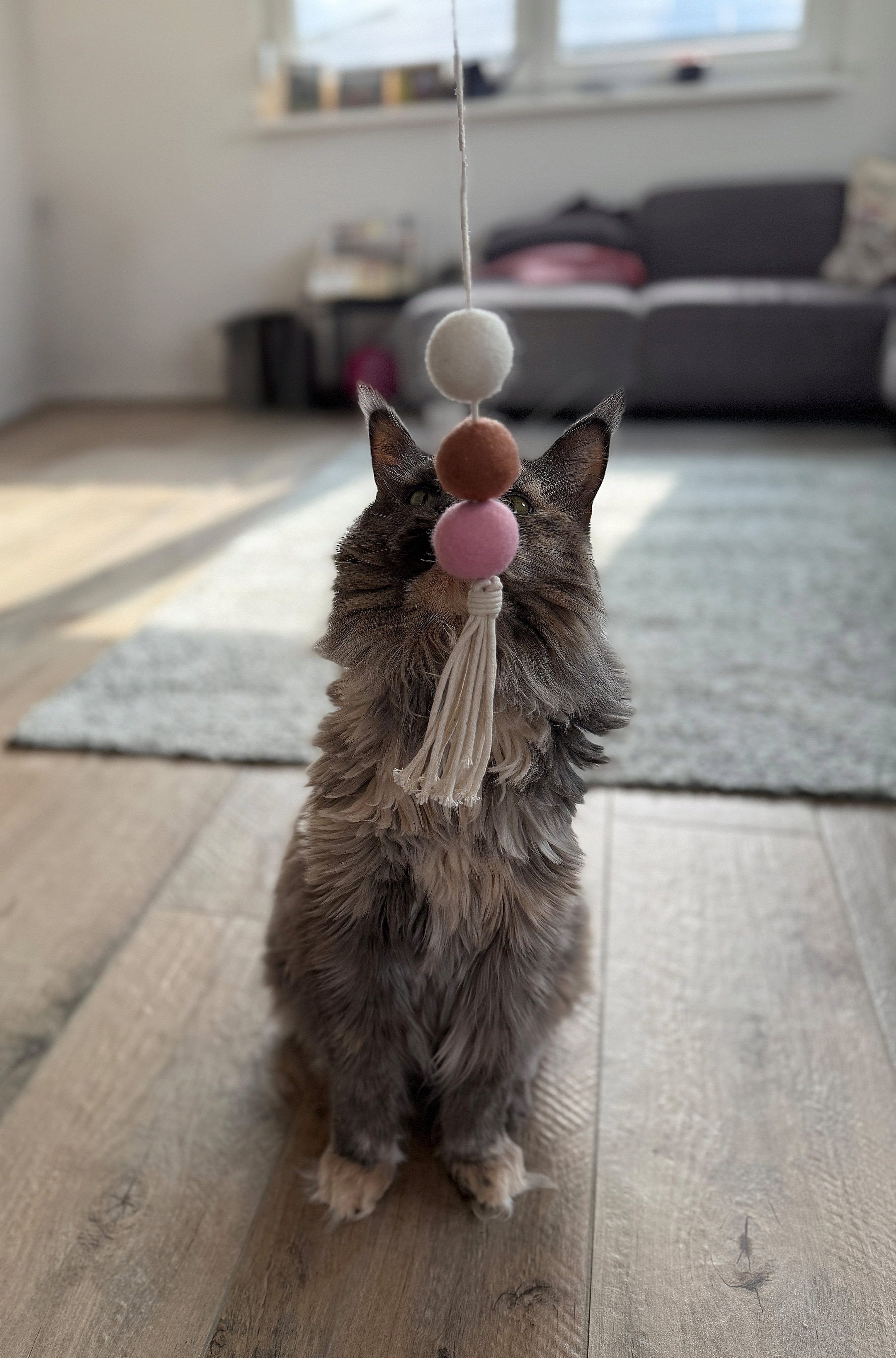 Mit diesem tollen Spielzeug lässt sich deine Katze sicher gerne angeln! Die robuste Ausführung mit Holzstab, 3 Filzkugeln und Knoten im Makramee-Look sorgt nicht nur für eine ansprechende Optik, sondern auch für stundenlangen Spielspaß.