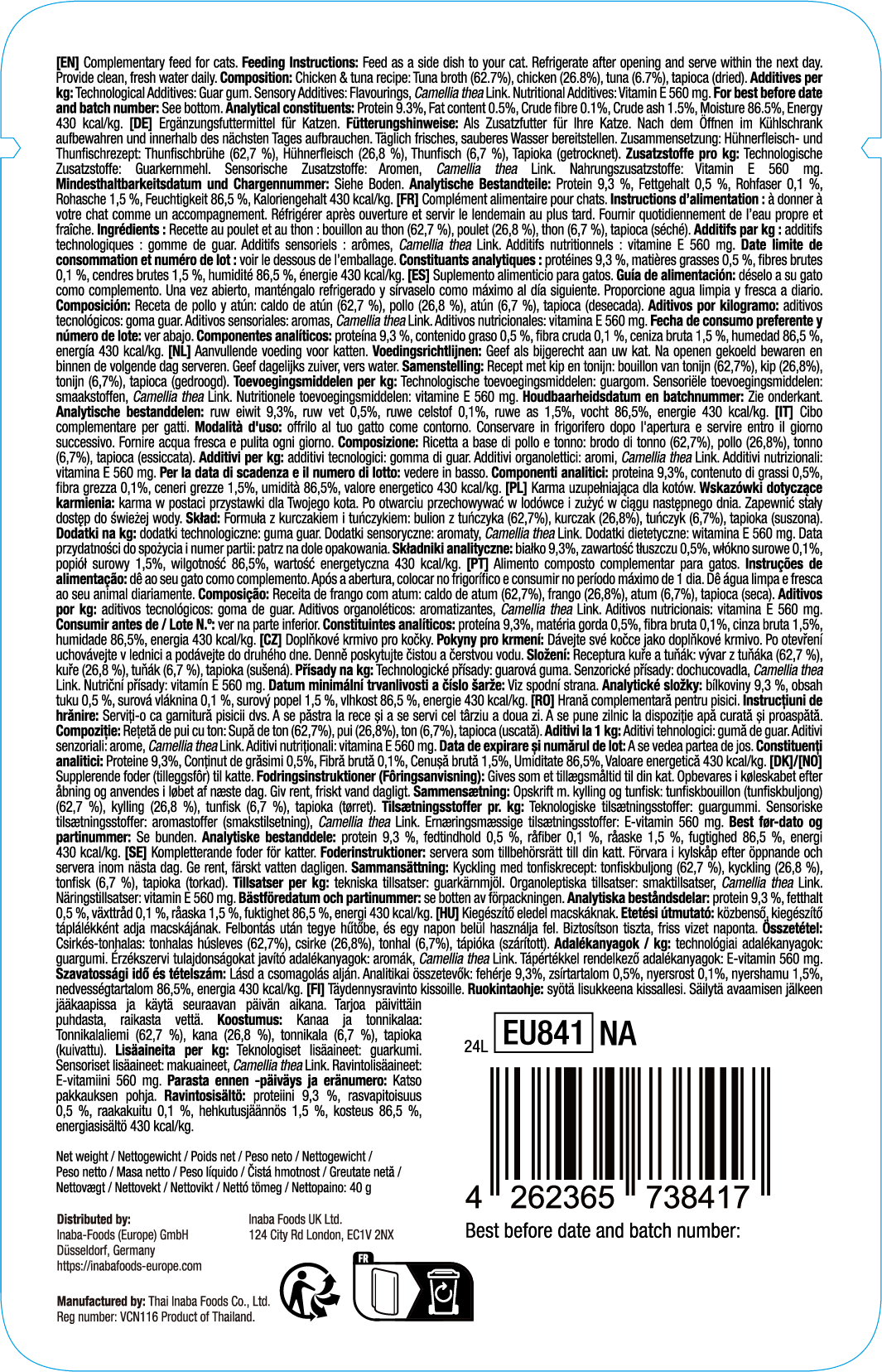 62,5 % Thunfisch-Brühe, 26,8 % Hühnerfleisch, 6,7 % Thunfisch, Tapioka getrocknet, Guarkernmehl, Agar, Aromen