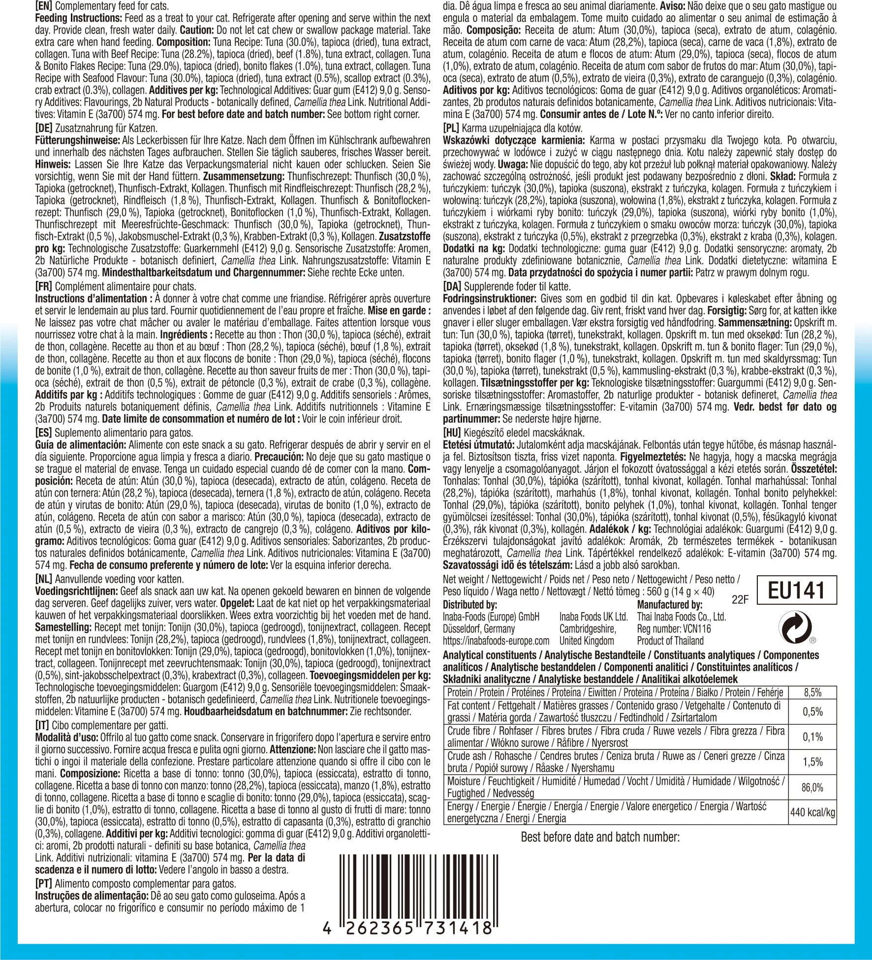 30 % Thunfisch, Tapioka getrocknet, 0,5 % Thunfisch-Extrakt, 0,3 % Jakobsmuschel-Extrakt, 0,3 % Krabben-Extrakt, Kollagen