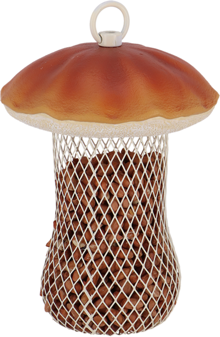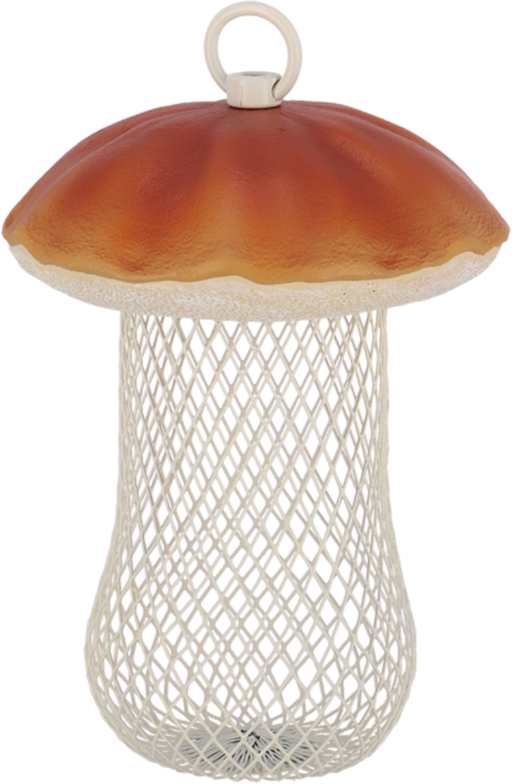 Bei diesem Steinpilz handelt es sich um eine liebevoll gestaltete Futterstelle für Vögel. Er lässt sich ganz einfach befüllen und verfügt über eine praktische Öse an der Kappe, an welcher er an Bäumen oder Sträuchern befestigt werden kann - die Vögel finden an dem feinmaschigen Gitter Halt und können so in aller Ruhe das Futter herauspicken.