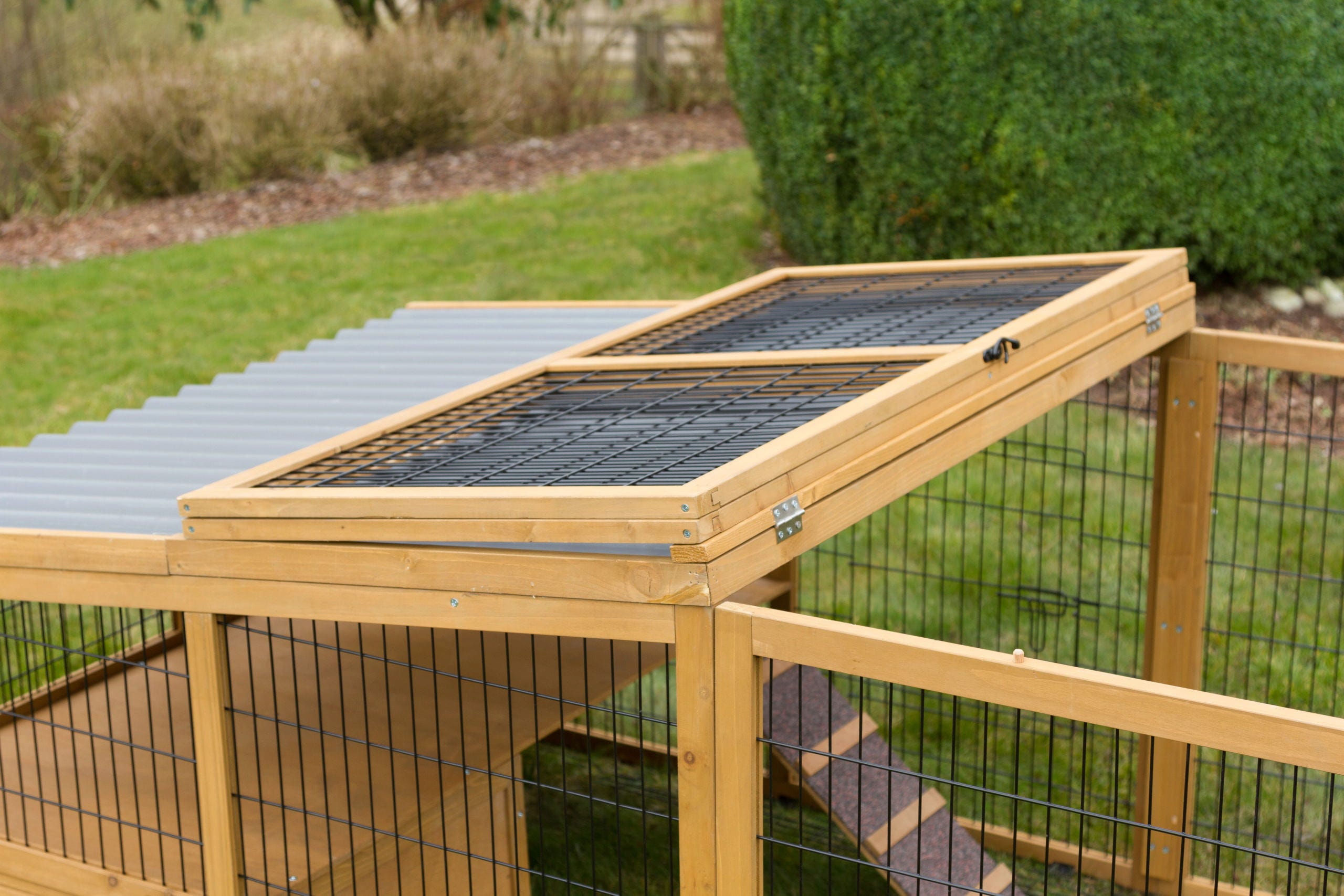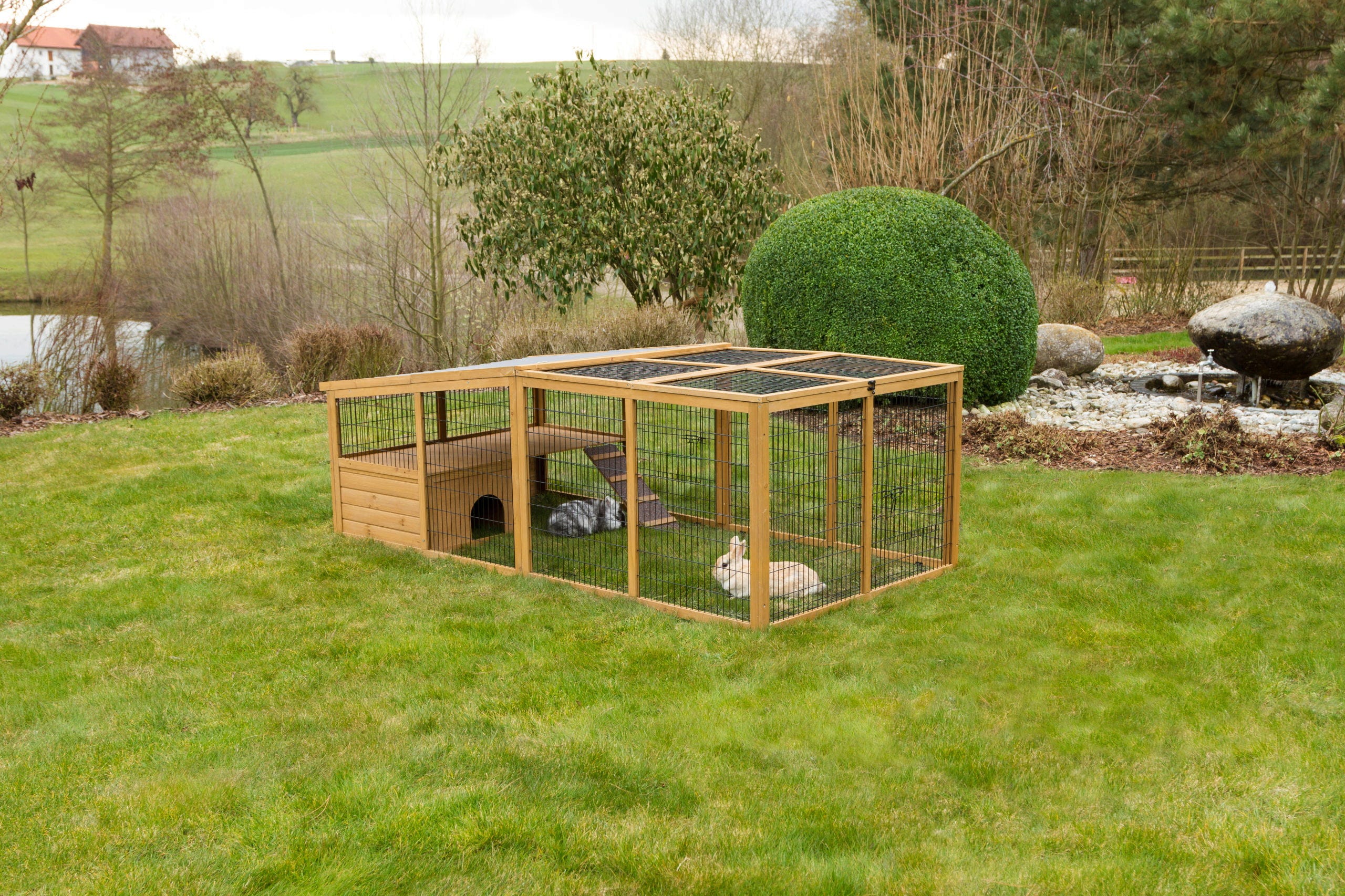 - Maximale Sicherheit: Die komplette Überdachung verhindert das Herausspringen der Tiere und bietet Schutz vor Fressfeinden; eine umlaufende Ausbruchssperre sichert das Gehege nach unten ab.