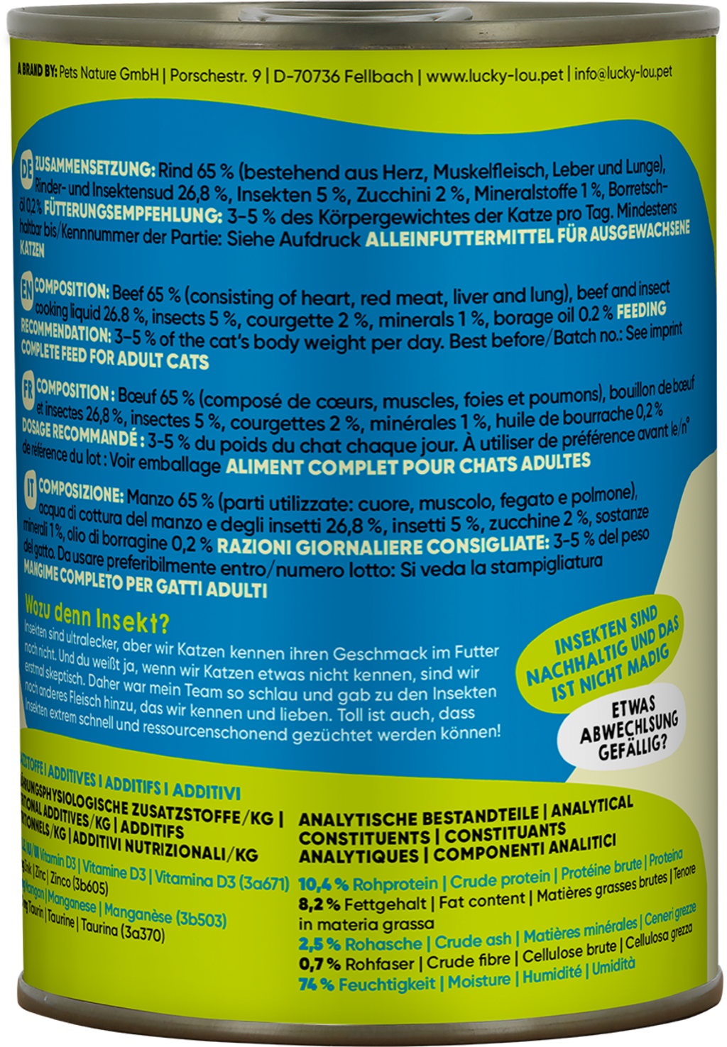 65 % Rind (Herz, Muskelfleisch, Leber, Lunge), 26,8 % Rinder- und Insektensud, 5 % Insekten, 2 % Zucchini, 1 % Mineralstoffe, 0,2 % Borretschöl