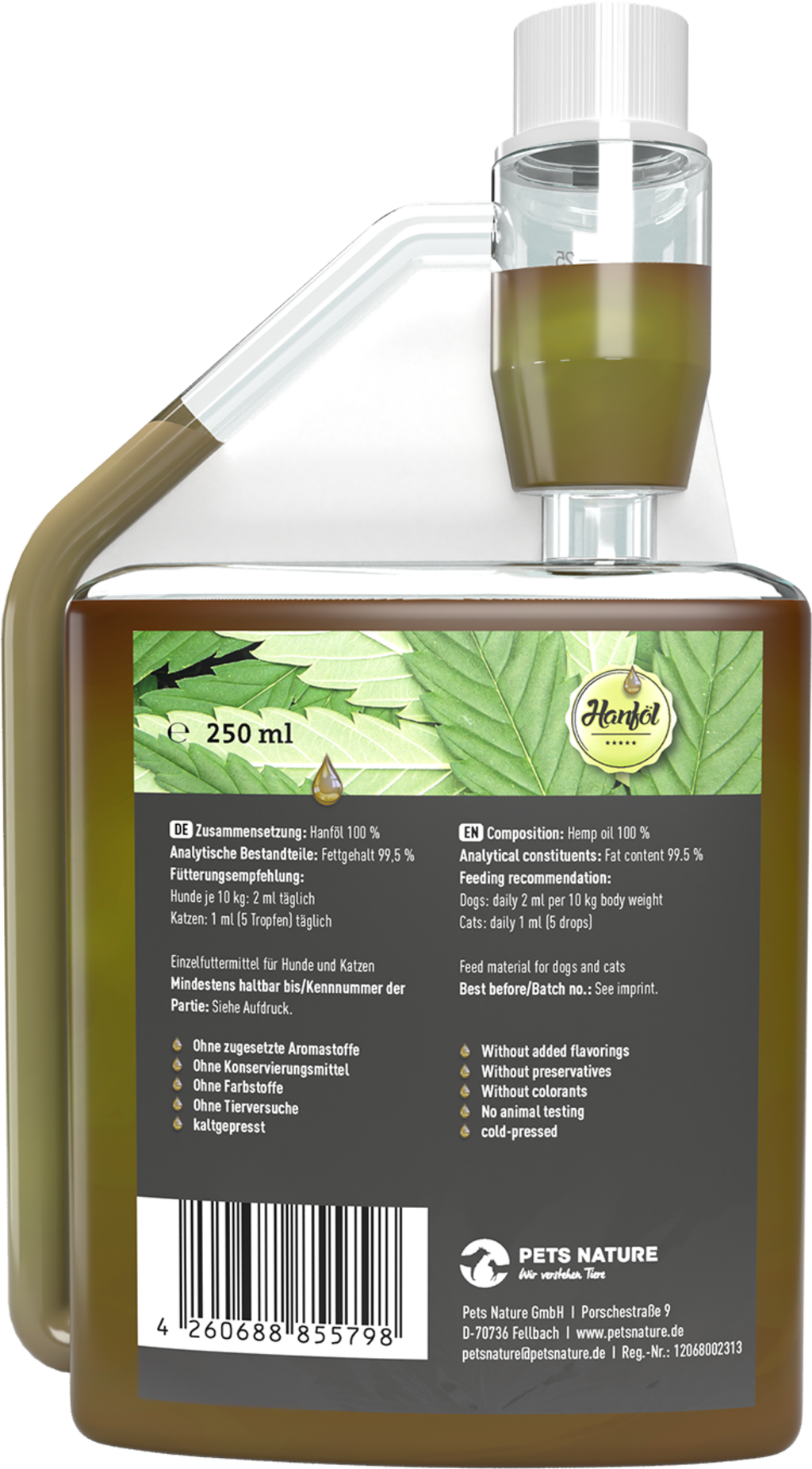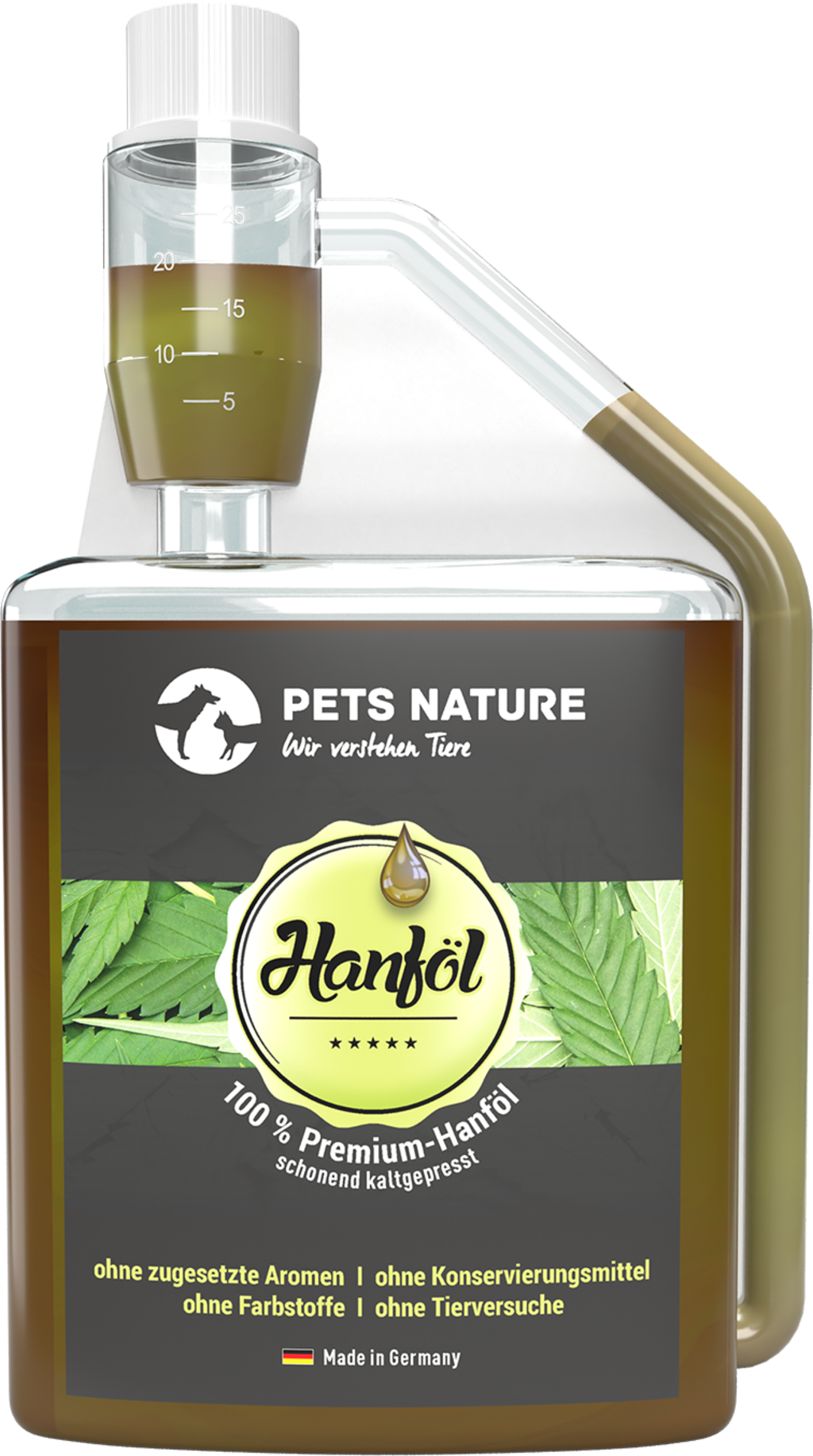 Dieses reine Hanföl versorgt deinen Hund oder deine Katze mit wertvollen ungesättigten Omega 3- und Omega 6-Fettsäuren und ist somit eine hochwertige Beigabe zum täglichen Hauptfutter deines vierbeinigen Lieblings.