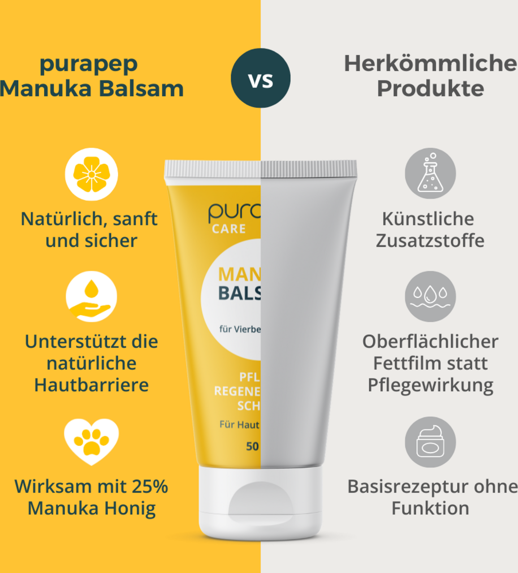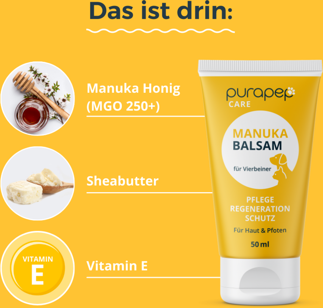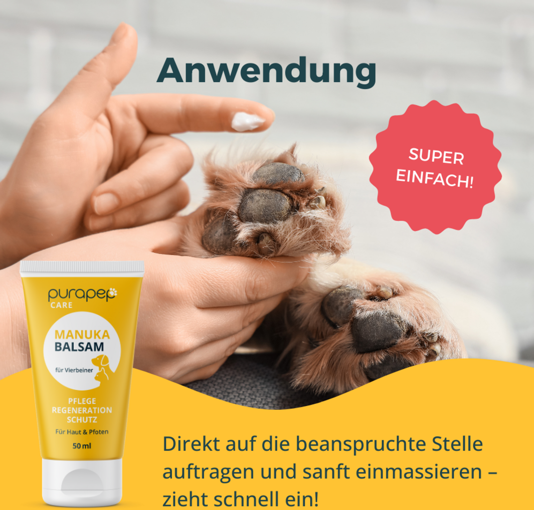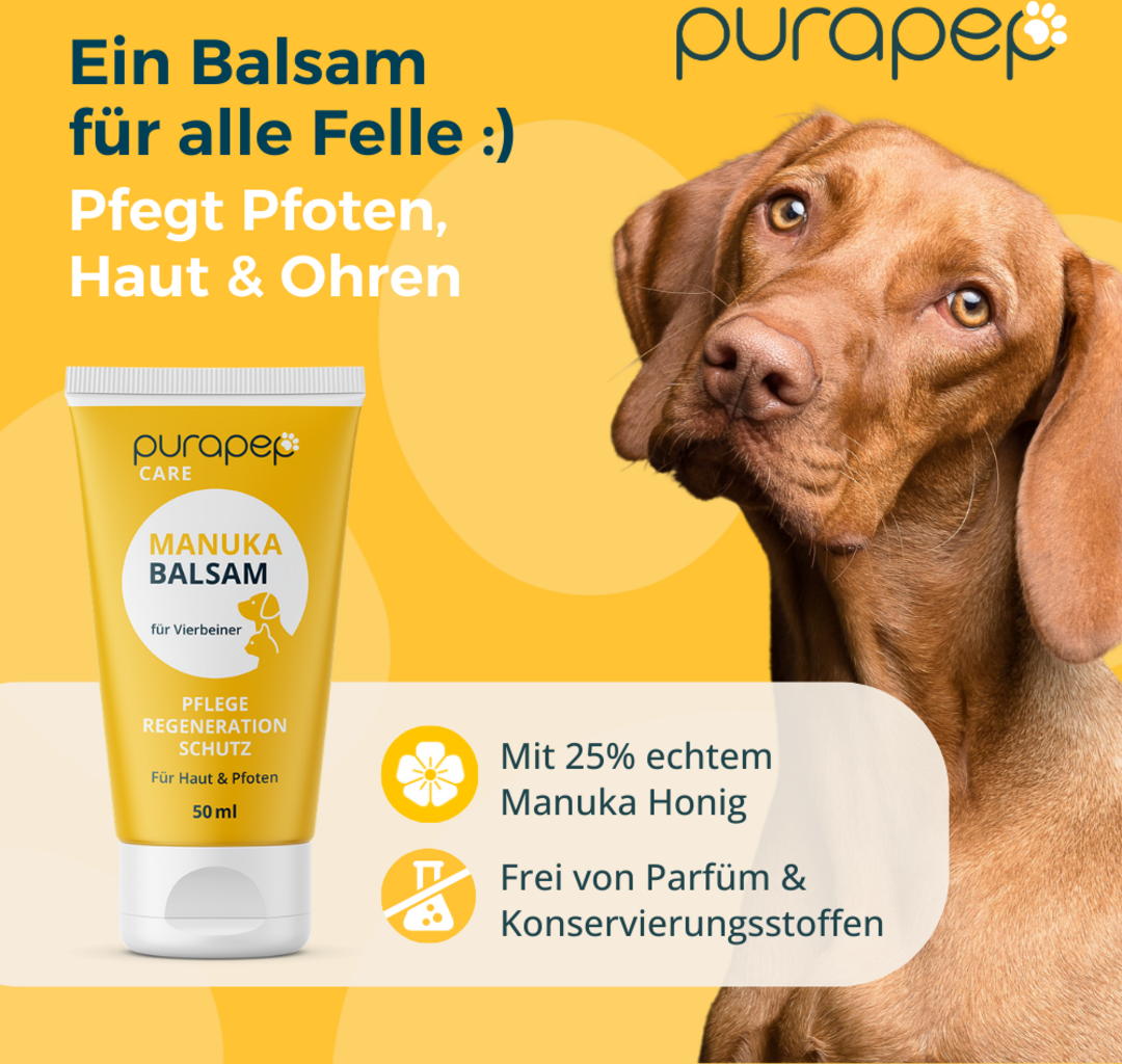 Verwöhne die Pfoten deines geliebten Vierbeiners mit dem purapep Care Manuka Balsam. Die speziell formulierte Pflege ist die ideale Lösung für rissige Pfoten und trockene, schuppige Haut.