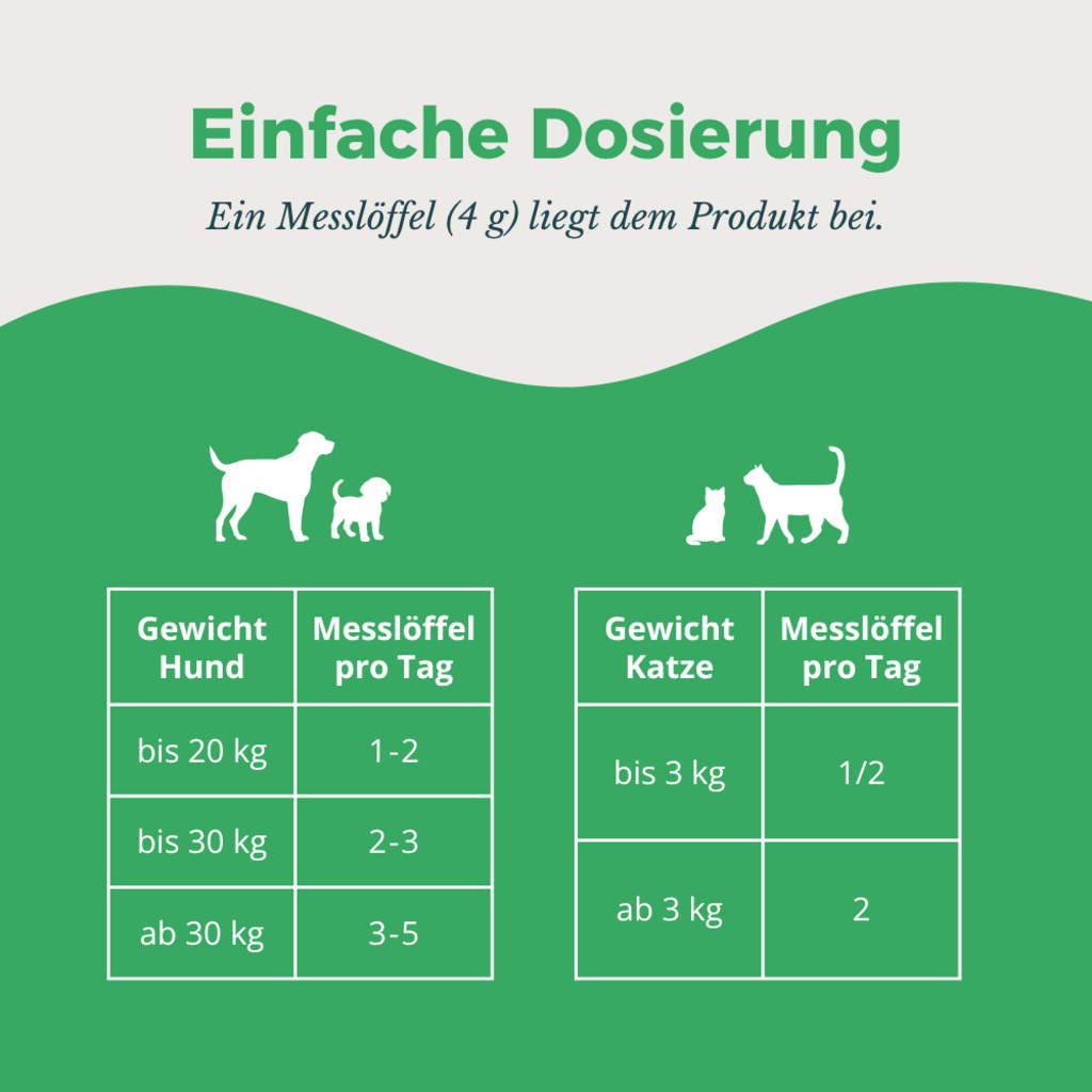 - Füttere am Anfang bitte nur die Hälfte der empfohlenen Tagesmenge, um sicherzugehen, dass dein Liebling das Pulver verträgt.
