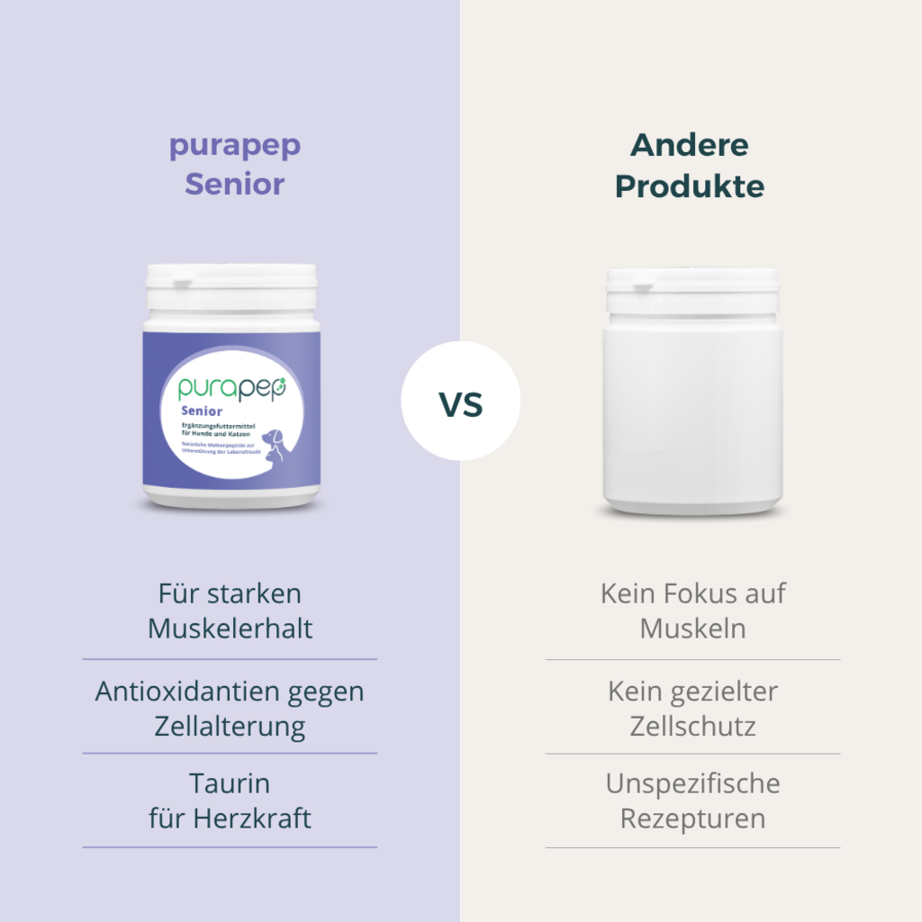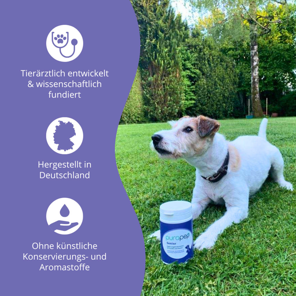Das purapep Senior ist ein hochwertiges Ergänzungsfutter in Pulverform, das speziell darauf ausgerichtet ist, die mentale und körperliche Leistungsfähigkeit von gealterten Katzen und Hunden zu unterstützen.
