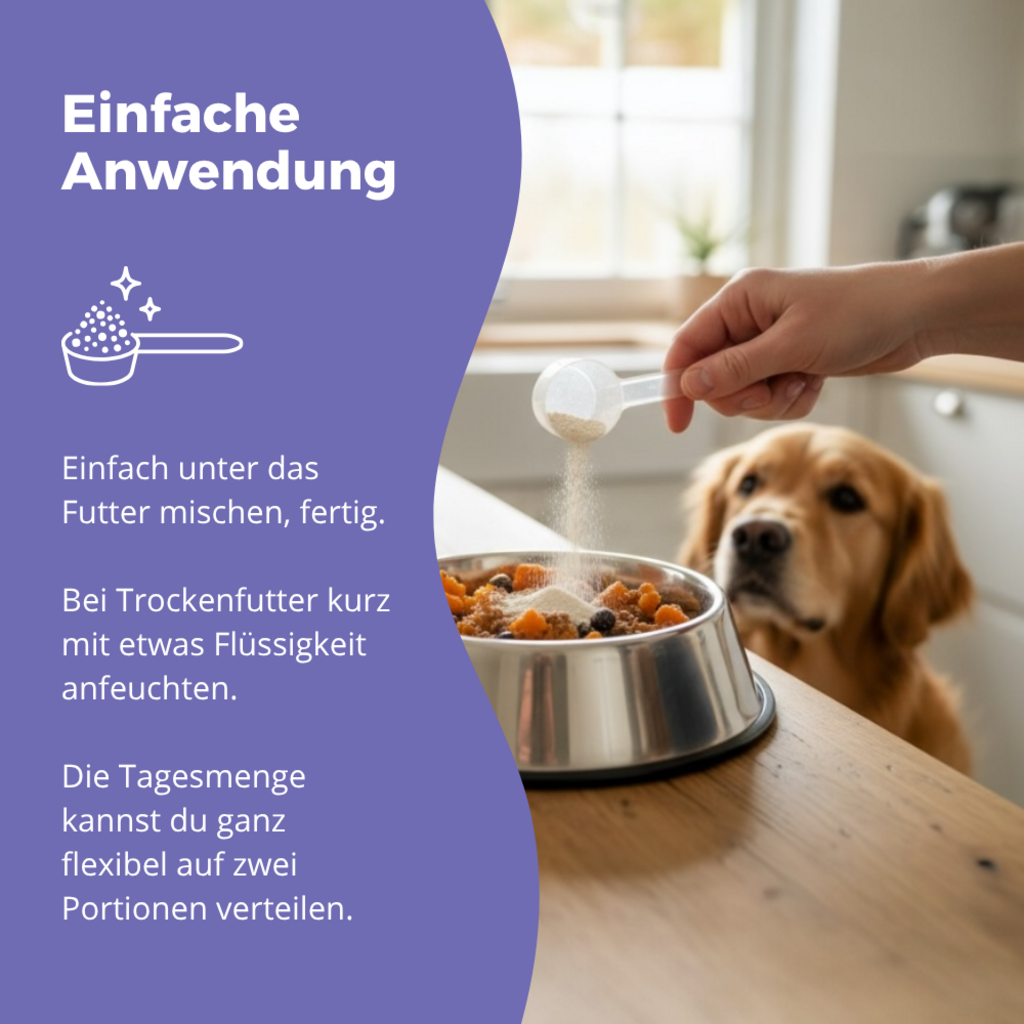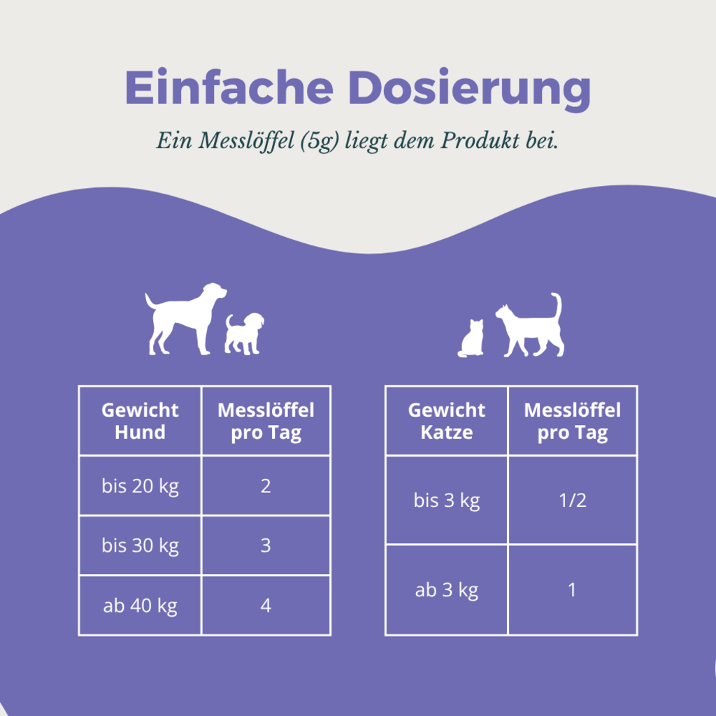 - Füttere am Anfang bitte nur die Hälfte der empfohlenen Tagesmenge, um sicherzugehen, dass dein Liebling das Pulver verträgt.