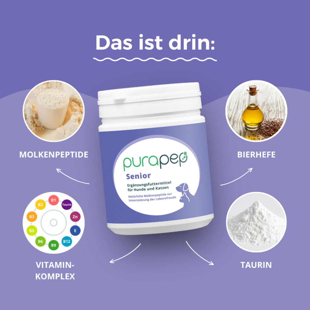 - purapep Senior enthält Geflügelproteine aus Geflügelleber (Huhn und Pute). Sollten Allergien gegenüber diesen Inhaltsstoffen bestehen, sollte purapep Senior nicht gefüttert werden.
